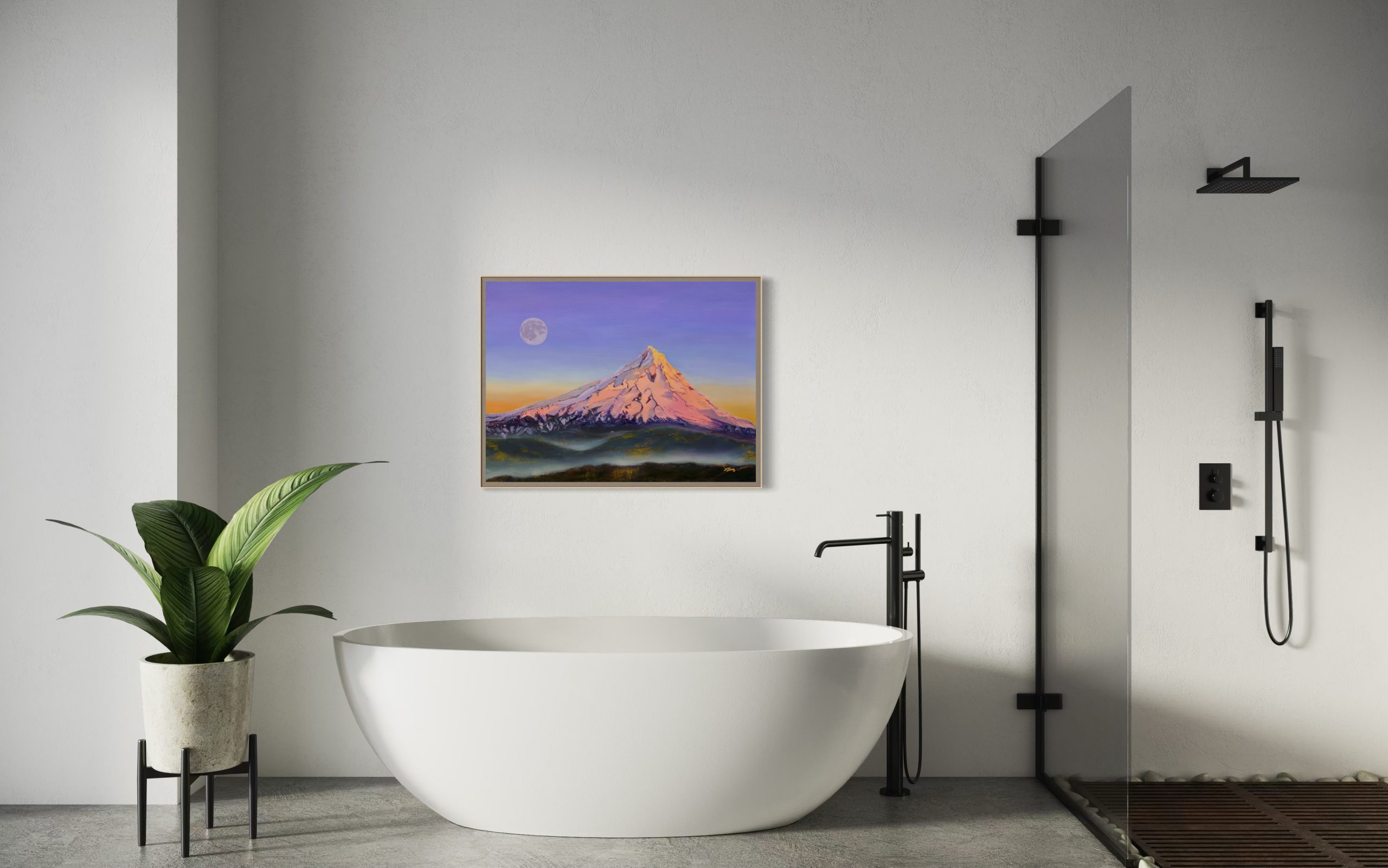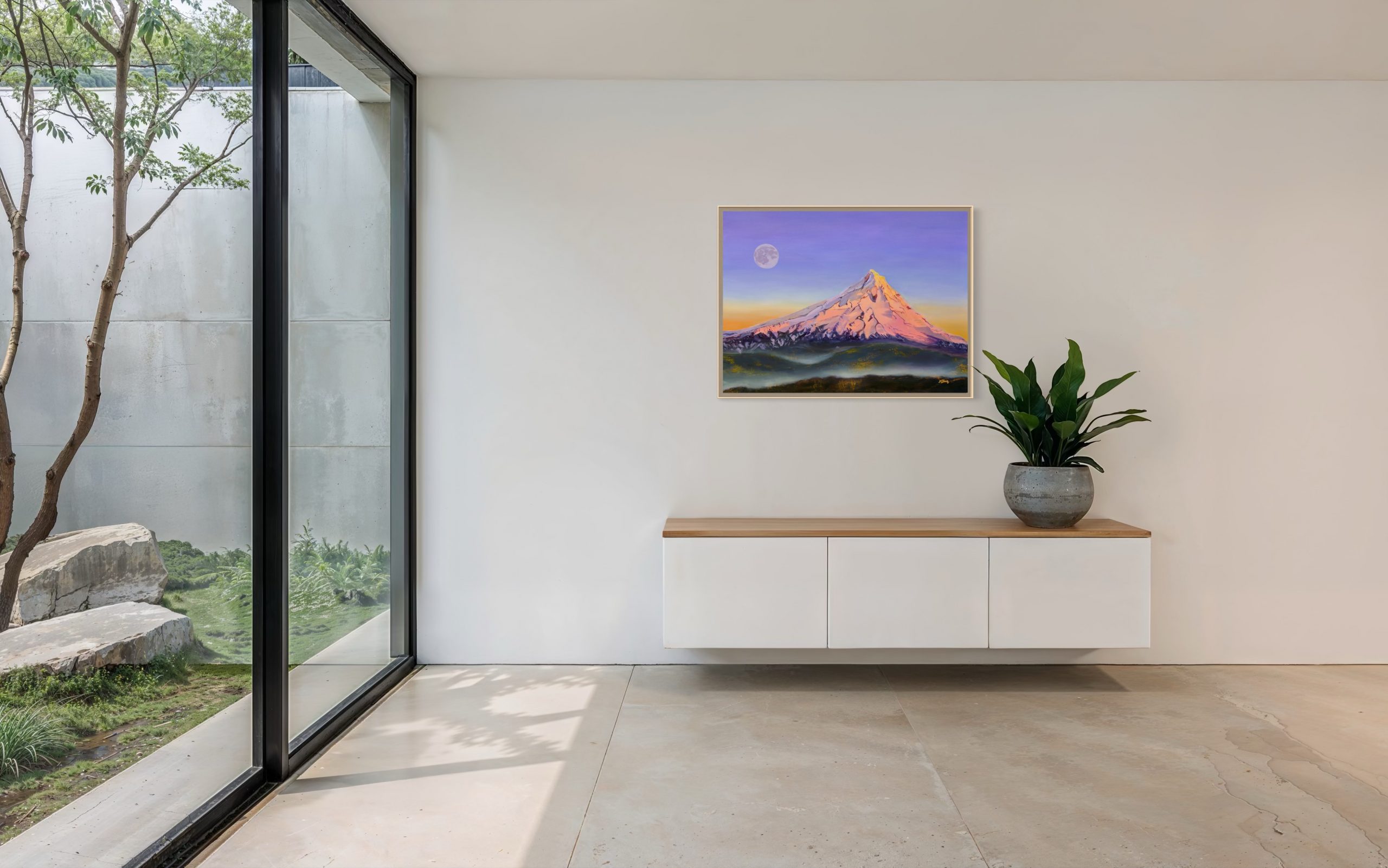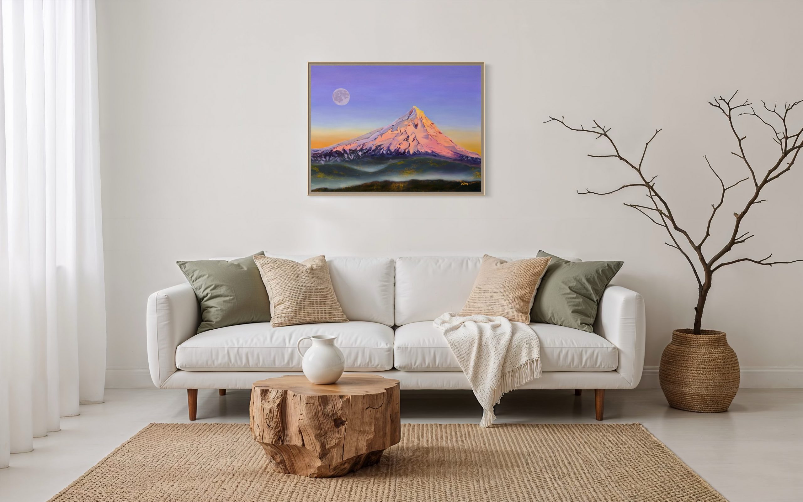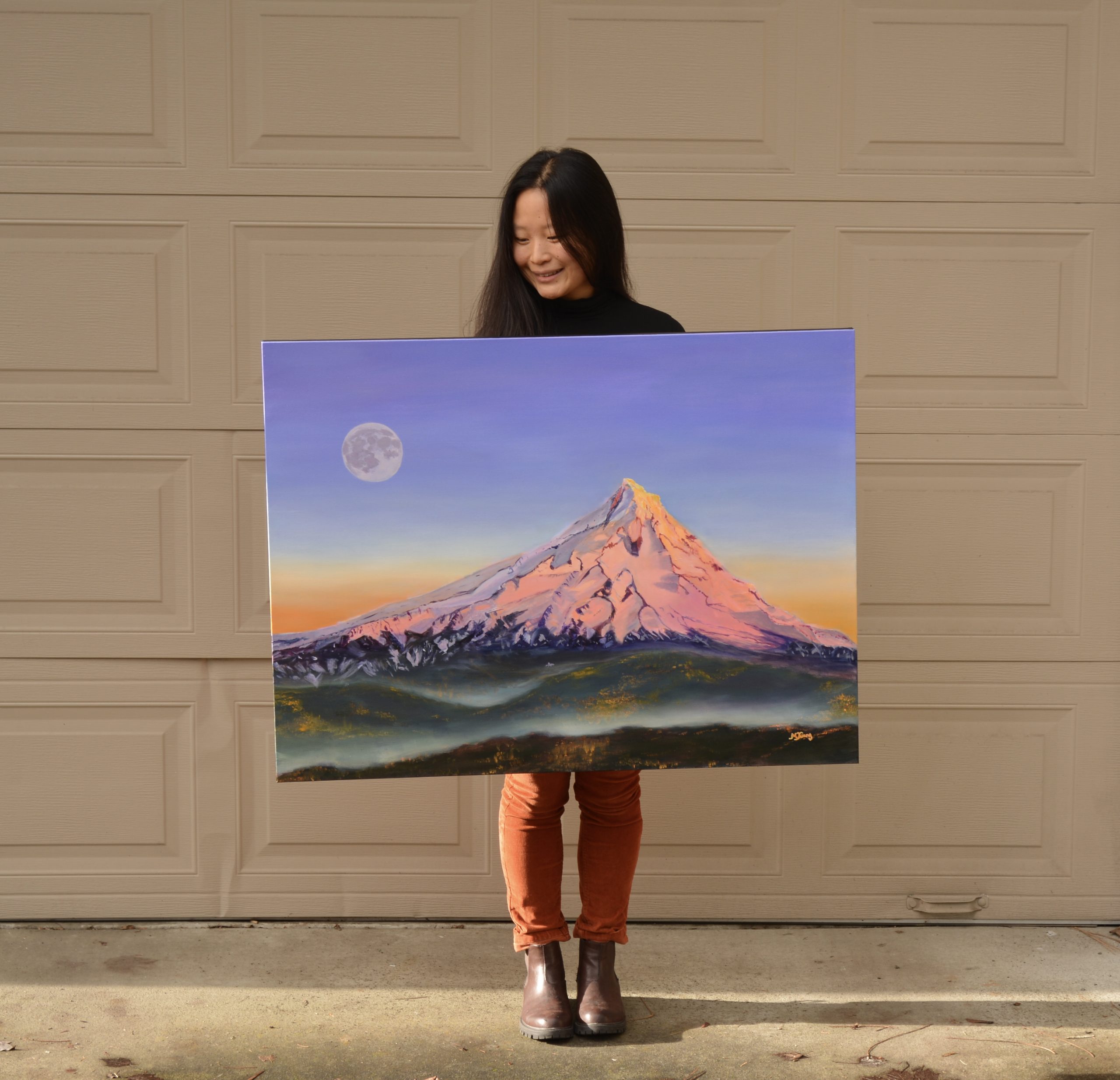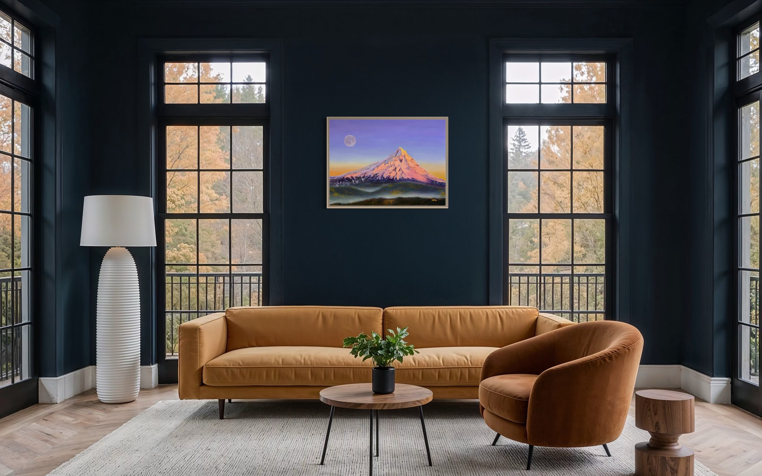 A peaceful moonrise over Wy’East (Mt. Hood) alpenglow, as seen from the Columbia River Gorge and White Salmon, Washington.